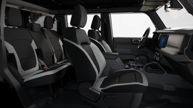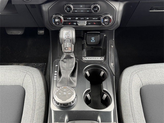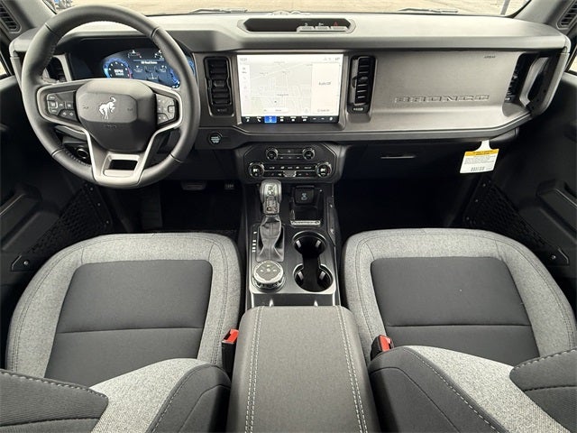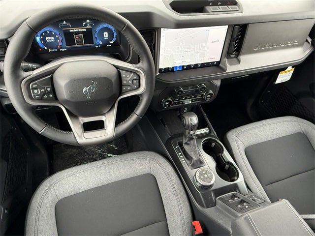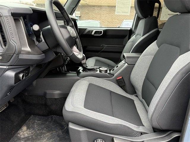 Azure Gray Metallic Tri-Coat 2025 Ford Bronco Big Bend 4WD 10-Speed Automatic 2.3L EcoBoost I-4 4-Wheel Disc Brakes, 4.46 Axle Ratio, 7 Speakers, ABS brakes, Air Conditioning, Alloy wheels, AM/FM radio: SiriusXM with 360L, AM/FM Stereo, Auto High-beam Headlights, Brake assist, Cloth Bucket Seats, Compass, Delay-off headlights, Driver door bin, Driver vanity mirror, Dual front impact airbags, Dual front side impact airbags, Electronic Stability Control, Emergency communication system: 911 Assist, Exterior Parking Camera Rear, Front anti-roll bar, Front Bucket Seats, Front Center Armrest, Front reading lights, Front wheel independent suspension, Fully automatic headlights, Heated door mirrors, Illuminated entry, Integrated roll-over protection, Internet access capable: FordPass Connect, Leather Shift Knob, Low tire pressure warning, Occupant sensing airbag, Outside temperature display, Overhead airbag, Overhead console, Panic alarm, Passenger door bin, Passenger vanity mirror, Power door mirrors, Power steering, Power windows, Radio data system, Remote keyless entry, Security system, SiriusXM w/360L, Speed control, Split folding rear seat, Steering wheel mounted audio controls, SYNC 4, Tachometer, Telescoping steering wheel, Tilt steering wheel, Traction control, Trip computer, Variably intermittent wipers, Wheels: 17 Carbonized Gray-Painted Aluminum.