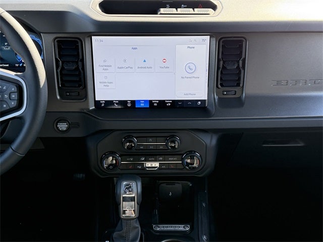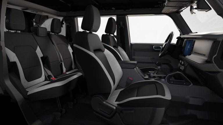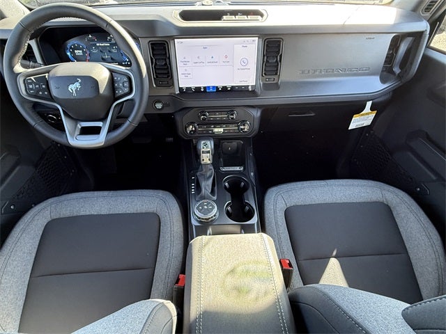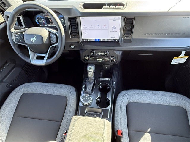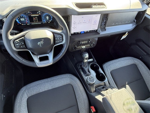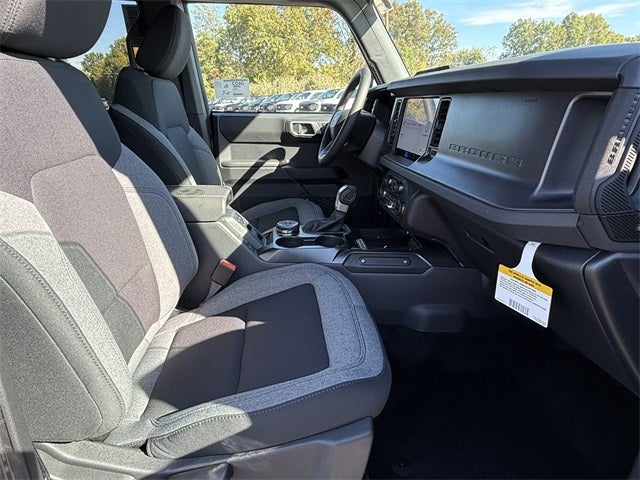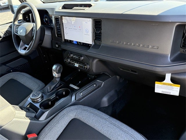 Carbonized Gray Metallic 2025 Ford Bronco Big Bend 4WD 10-Speed Automatic 2.3L EcoBoost I-4 2-Door Intelligent Access w/Lock/Unlock, 4-Wheel Disc Brakes, 4.46 Axle Ratio, 7 Speakers, ABS brakes, Air Conditioning, Alloy wheels, AM/FM radio: SiriusXM with 360L, AM/FM Stereo, Ambient Footwell Lighting, Auto High-Beam Headlamps, Auto High-beam Headlights, BLIS Blind Spot Information System, Brake assist, Cloth Bucket Seats, Compass, Connected Navigation, Delay-off headlights, Dr & Pass Illuminated Sliding Visor Vanity Mirrors, Driver door bin, Driver vanity mirror, Dual front impact airbags, Dual front side impact airbags, Dual Smart Charging USB Ports, Dual-Zone Electronic Automatic Temperature Control, Electronic Stability Control, Emergency communication system: 911 Assist, Equipment Group 222A Mid Package, Exterior Parking Camera Rear, Front anti-roll bar, Front Bucket Seats, Front Center Armrest, Front reading lights, Front Row Heated Seats, Front wheel independent suspension, Fully automatic headlights, Heated door mirrors, Illuminated entry, Integrated roll-over protection, Internet access capable: FordPass Connect, Lane-Keeping System, Leather Shift Knob, Low tire pressure warning, Occupant sensing airbag, Outside temperature display, Overhead airbag, Overhead console, Panic alarm, Passenger door bin, Passenger vanity mirror, Power door mirrors, Power Outlet - Back Side of Center Floor Console, Power steering, Power windows, Pre-Collision Assist w/Automatic Emergency Braking, Radio data system, Rear Parking Sensors, Rear-View Camera, Remote keyless entry, Security system, SiriusXM w/360L, Speed control, Split folding rear seat, Steering wheel mounted audio controls, SYNC 4, Tachometer, Telescoping steering wheel, Tilt steering wheel, Traction control, Trip computer, Variably intermittent wipers, Wheels: 17 Carbonized Gray-Painted Aluminum.