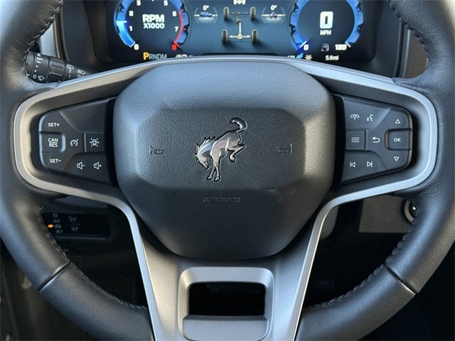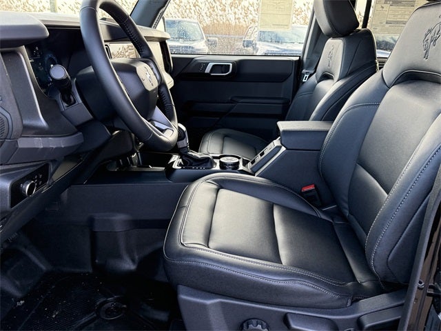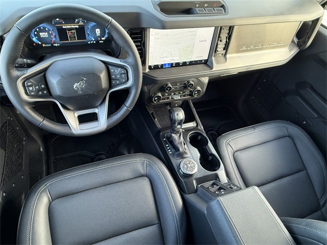 Shadow Black 2025 Ford Bronco Big Bend 4WD 10-Speed Automatic 2.3L EcoBoost I-4 4-Wheel Disc Brakes, 4.46 Axle Ratio, 7 Speakers, ABS brakes, Air Conditioning, Alloy wheels, AM/FM radio: SiriusXM with 360L, AM/FM Stereo, Auto High-beam Headlights, Brake assist, Cloth Bucket Seats, Compass, Delay-off headlights, Driver door bin, Driver vanity mirror, Dual front impact airbags, Dual front side impact airbags, Electronic Stability Control, Emergency communication system: 911 Assist, Exterior Parking Camera Rear, Front anti-roll bar, Front Bucket Seats, Front Center Armrest, Front reading lights, Front wheel independent suspension, Fully automatic headlights, Heated door mirrors, Illuminated entry, Integrated roll-over protection, Internet access capable: FordPass Connect, Leather Shift Knob, Low tire pressure warning, Occupant sensing airbag, Outside temperature display, Overhead airbag, Overhead console, Panic alarm, Passenger door bin, Passenger vanity mirror, Power door mirrors, Power steering, Power windows, Radio data system, Remote keyless entry, Security system, SiriusXM w/360L, Speed control, Split folding rear seat, Steering wheel mounted audio controls, SYNC 4, Tachometer, Telescoping steering wheel, Tilt steering wheel, Traction control, Trip computer, Variably intermittent wipers, Wheels: 17 Carbonized Gray-Painted Aluminum.