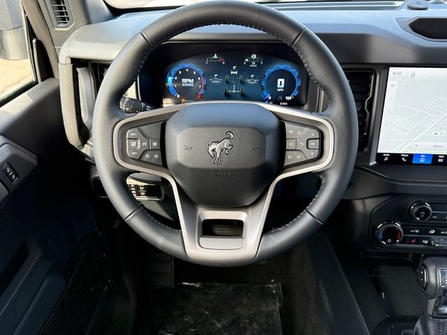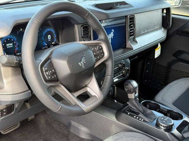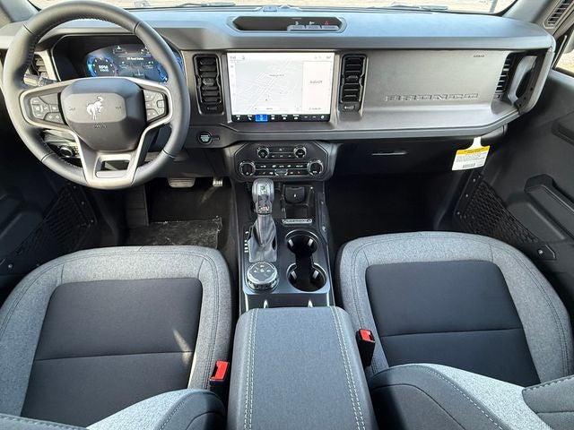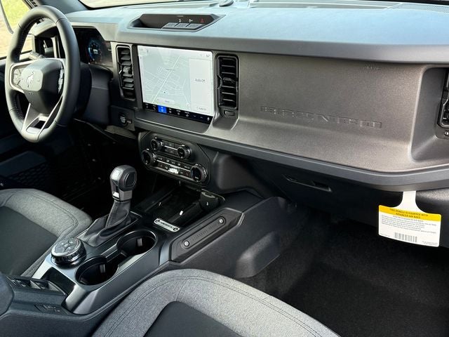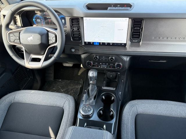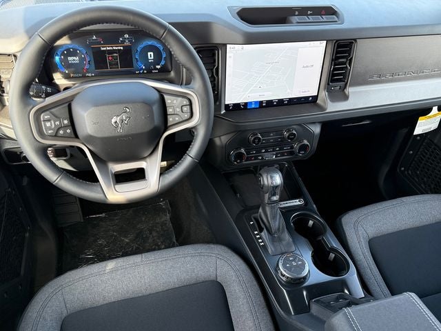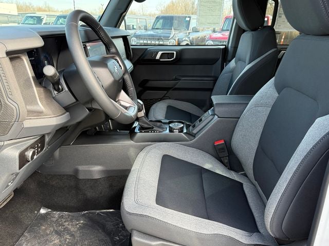 Oxford White 2026 Ford Bronco Big Bend 4WD 10-Speed Automatic 2.3L EcoBoost I-4 2-Door Intelligent Access with Lock/Unlock, 4-Wheel Disc Brakes, 4.46 Axle Ratio, 7 Speakers, ABS brakes, Air Conditioning, Alloy wheels, AM/FM radio: SiriusXM with 360L, AM/FM Stereo, Ambient Footwell Lighting, Auto High-Beam Headlamps, Auto High-beam Headlights, BLIS Blind Spot Information System, Brake assist, Carbonized Gray Molded-in-Color Hard Top, Cloth Bucket Seats, Compass, Connected Navigation, Delay-off headlights, Driver and Front Passenger Illuminated Sliding Visor Vanity Mirrors, Driver door bin, Driver vanity mirror, Dual front impact airbags, Dual front side impact airbags, Dual Smart Charging USB Ports, Dual-Zone Electronic Automatic Temperature Control, Electronic Stability Control, Emergency communication system: 911 Assist, Equipment Group 222A Mid Package, Exterior Parking Camera Rear, Ford Connectivity Package (1-Year Included), Front and Rear Floor Liners Without Carpet Floor Mats, Front anti-roll bar, Front Bucket Seats, Front Center Armrest, Front reading lights, Front Row Heated Seats, Front wheel independent suspension, Fully automatic headlights, Heated door mirrors, Illuminated entry, Integrated roll-over protection, Lane-Keeping System, Low tire pressure warning, Occupant sensing airbag, Outside temperature display, Overhead airbag, Overhead console, Panic alarm, Passenger door bin, Passenger vanity mirror, Power door mirrors, Power steering, Power windows, Pre-Collision Assist with Automatic Emergency Braking, Pro Power Onboard - 400W, Radio data system, Rear Parking Sensors, Rear-View Camera, Rear-Window Defroster and Washer, Remote keyless entry, Security system, Side Step, SiriusXM with 360L, Speed control, Split folding rear seat, Steering wheel mounted audio controls, SYNC 4, Tachometer, Telescoping steering wheel, Tilt steering wheel, Traction control, Trip computer, Variably intermittent wipers, Wheels: 17 Carbonized Gray-Painted Aluminum.