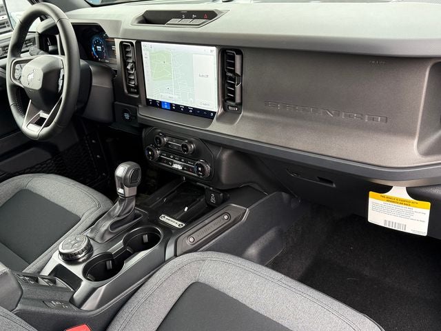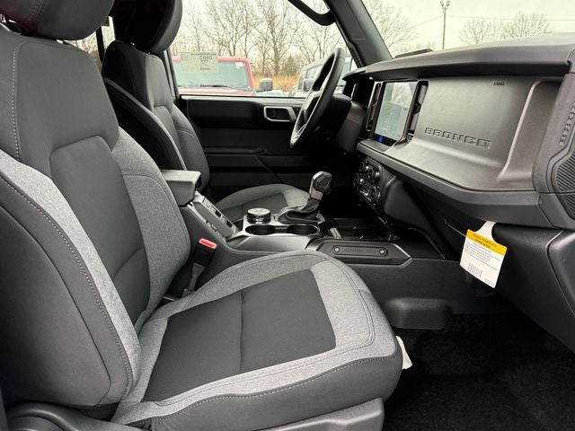 Oxford White 2026 Ford Bronco Big Bend 4WD 10-Speed Automatic 2.3L EcoBoost I-4 2-Door Intelligent Access with Lock/Unlock, 4-Wheel Disc Brakes, 4.46 Axle Ratio, 7 Speakers, ABS brakes, Air Conditioning, Alloy wheels, AM/FM radio: SiriusXM with 360L, AM/FM Stereo, Ambient Footwell Lighting, Auto High-Beam Headlamps, Auto High-beam Headlights, BLIS Blind Spot Information System, Brake assist, Carbonized Gray Molded-in-Color Hard Top, Cloth Bucket Seats, Compass, Connected Navigation, Delay-off headlights, Driver and Front Passenger Illuminated Sliding Visor Vanity Mirrors, Driver door bin, Driver vanity mirror, Dual front impact airbags, Dual front side impact airbags, Dual Smart Charging USB Ports, Dual-Zone Electronic Automatic Temperature Control, Electronic Stability Control, Emergency communication system: 911 Assist, Equipment Group 222A Mid Package, Exterior Parking Camera Rear, Ford Connectivity Package (1-Year Included), Front anti-roll bar, Front Bucket Seats, Front Center Armrest, Front reading lights, Front Row Heated Seats, Front wheel independent suspension, Fully automatic headlights, Heated door mirrors, Illuminated entry, Integrated roll-over protection, Lane-Keeping System, Low tire pressure warning, Occupant sensing airbag, Outside temperature display, Overhead airbag, Overhead console, Panic alarm, Passenger door bin, Passenger vanity mirror, Power door mirrors, Power steering, Power windows, Pre-Collision Assist with Automatic Emergency Braking, Pro Power Onboard - 400W, Radio data system, Rear Parking Sensors, Rear-View Camera, Rear-Window Defroster and Washer, Remote keyless entry, Security system, SiriusXM with 360L, Speed control, Split folding rear seat, Steering wheel mounted audio controls, SYNC 4, Tachometer, Telescoping steering wheel, Tilt steering wheel, Traction control, Trip computer, Variably intermittent wipers, Wheels: 17 Carbonized Gray-Painted Aluminum.