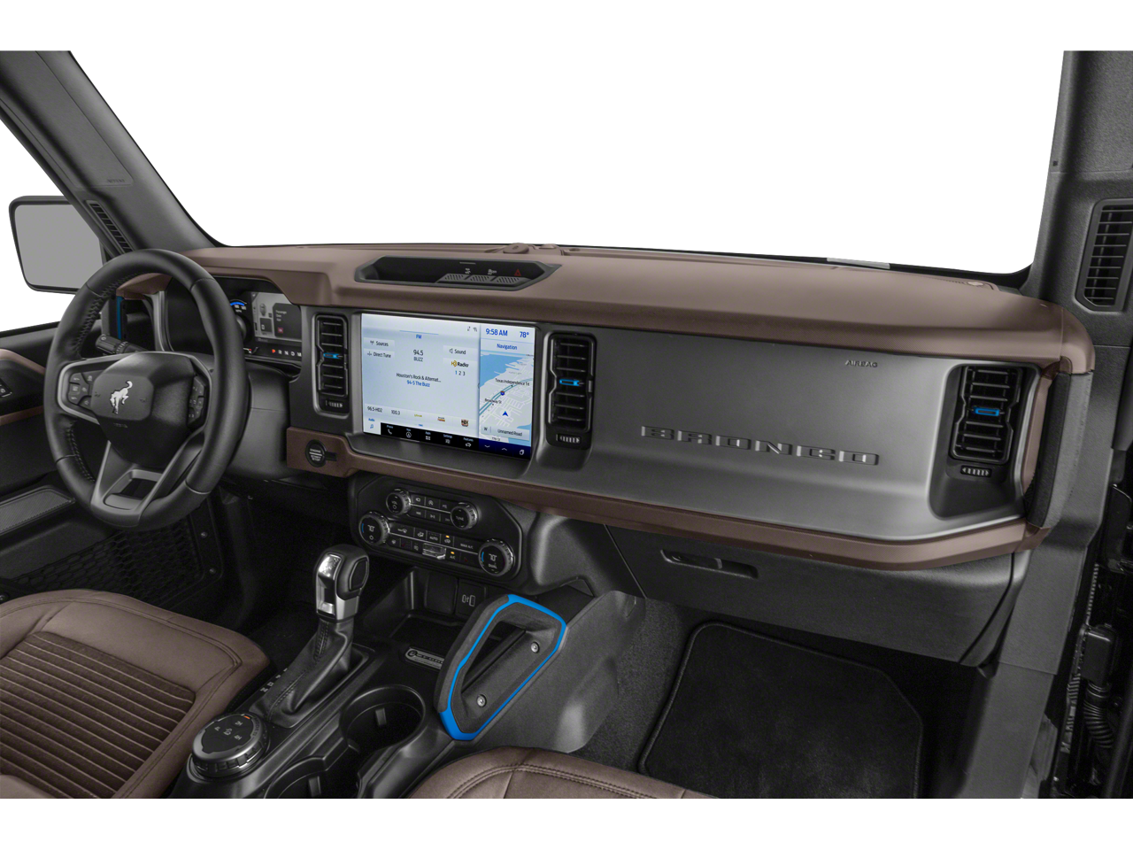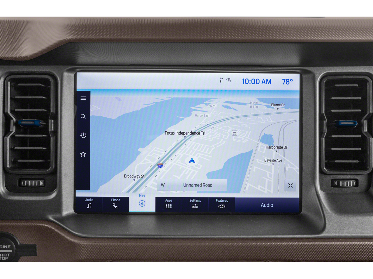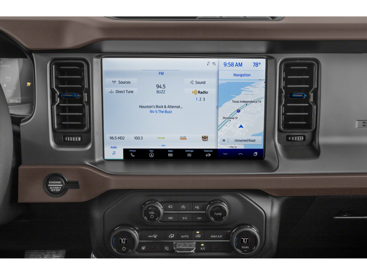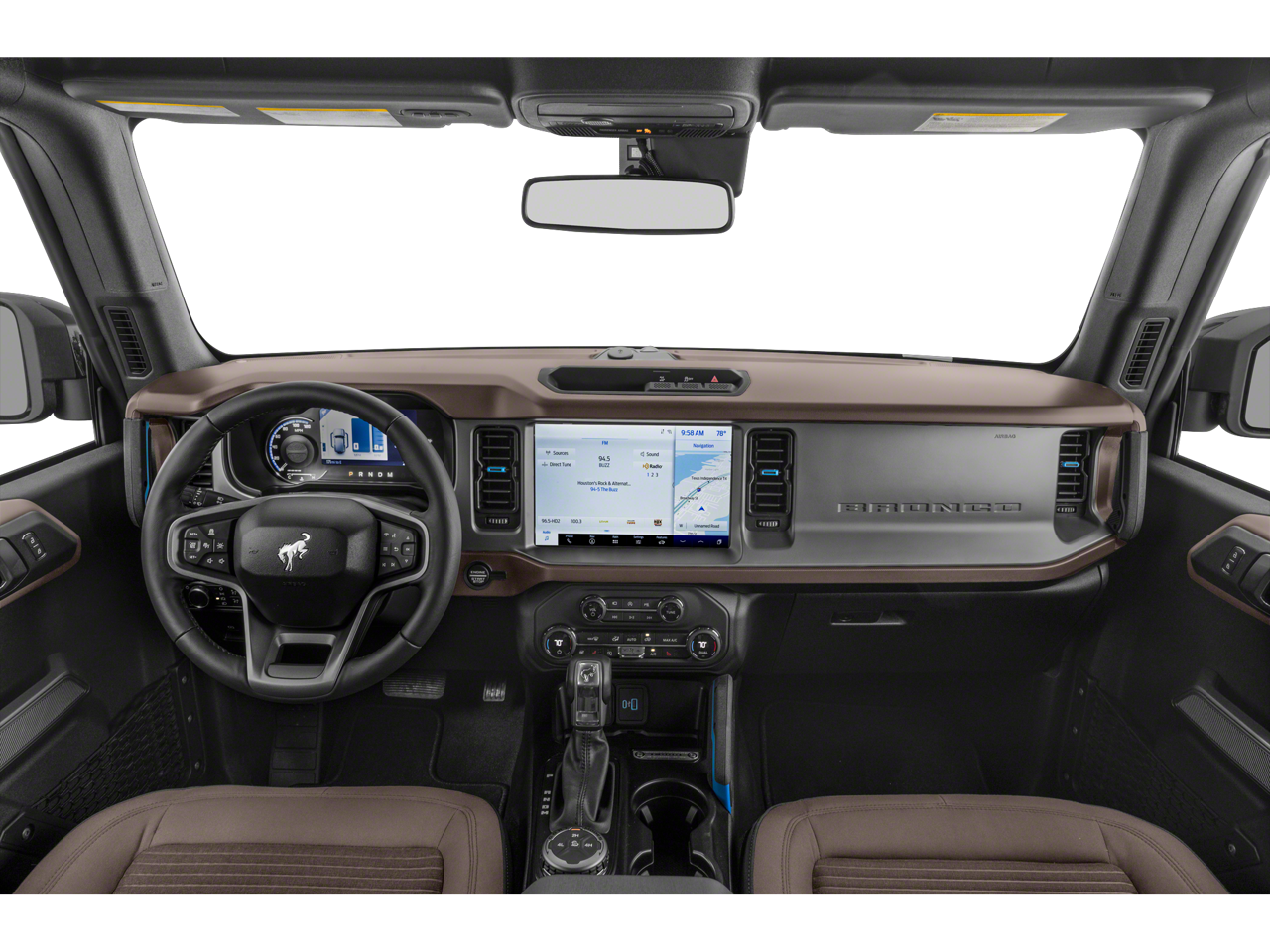 12 LCD Capacitive Touchscreen w/Swipe Capability, 18 Bright Machined Aluminum Wheels, 3.73 Axle Ratio, 360-Degree Camera, 4-Wheel Disc Brakes, 6 Speakers, ABS brakes, Additional Sound Deadening, Air Conditioning, Alloy wheels, AM/FM radio: SiriusXM with 360L, AM/FM Stereo, Auto High-beam Headlights, Auto-dimming Rear-View mirror, Automatic temperature control, Brake assist, Compass, Connected Built-In Navigation, Connected Navigation, Delay-off headlights, Driver door bin, Driver vanity mirror, Dual front impact airbags, Dual front side impact airbags, Electronic Stability Control, Emergency communication system: 911 Assist, Equipment Group 313A High Package, Exterior Parking Camera Rear, Front anti-roll bar, Front Bucket Seats, Front Center Armrest, Front dual zone A/C, Front fog lights, Front Parking Sensors, Front reading lights, Front wheel independent suspension, Fully automatic headlights, Heated Cloth Bucket Seats, Heated door mirrors, Heated front seats, Illuminated entry, Information on Demand Panel, Integrated roll-over protection, Keyless Entry Keypad, Leather Shift Knob, Low tire pressure warning, Navigation system: Connected Navigation, Occupant sensing airbag, Outside temperature display, Overhead airbag, Overhead console, Panic alarm, Passenger door bin, Passenger vanity mirror, Power door mirrors, Power steering, Power windows, Radio data system, Remote keyless entry, Security system, Sideview Mirrors, SiriusXM Radio w/360L, Speed control, Split folding rear seat, Steering wheel mounted audio controls, SYNC 4, Tachometer, Telescoping steering wheel, Tilt steering wheel, Traction control, Trip computer, Variably intermittent wipers, Voltmeter. Oxford White 2022 Ford Bronco Outer Banks 4WD 10-Speed Automatic 2.3L EcoBoost I-4